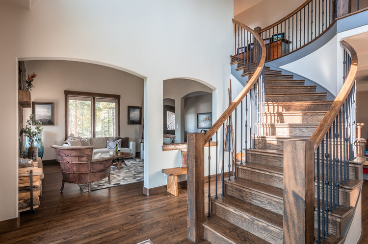 This Kittredge mountain-style home had great bones, but really needed to find its identity! We made the front entry the focal-point with custom double front doors (one of our favorite parts!). On the main level, we added new hardwood floors, updated the old (carpeted!) staircase with heavy rustic newel posts and aged iron ranch-looking balusters. In the front room, the original fireplace was underwhelming - so we installed a large wood-burning unit with warm, clean-cut stones and a hand-scraped wood mantel. The entire home interior was painted, and the old orange oak trim was replaced with knotty alder that was then stained to match the new floors.